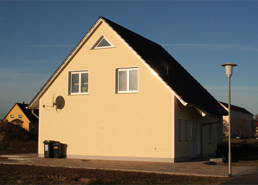 Die Vorgaben der Bauherren, brachten einen Entwurf hervor, der ein optimales Verhältnis zwischen Kubatur und Fläche aufweist. Maximale Nutzfläche bei minimalem umbauten Raum. Durch ein Pfettendach und eine moderne Fassade mit Wärmedämmverbundsystem auf einem bau- physikalisch hervorragendem Stein entsteht trotzdem eine gewisse persönliche Note.
