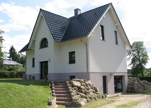 Auf diesem spezielle Bauplatz mit wurde ein Entwurf realisiert, der durch die Treppenanlage unter dem Friesen Giebel einen ebenerdigen Zugang zum Haus, zur Garage und zur Terrasse ermöglicht.